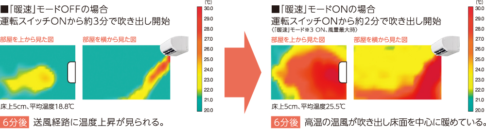 「暖速」モードでコンプレッサーをあらかじめ予熱しておくことによって、暖房時の立ち上がりのスピードが飛躍的に向上しました。