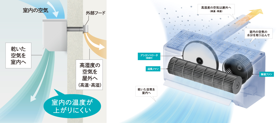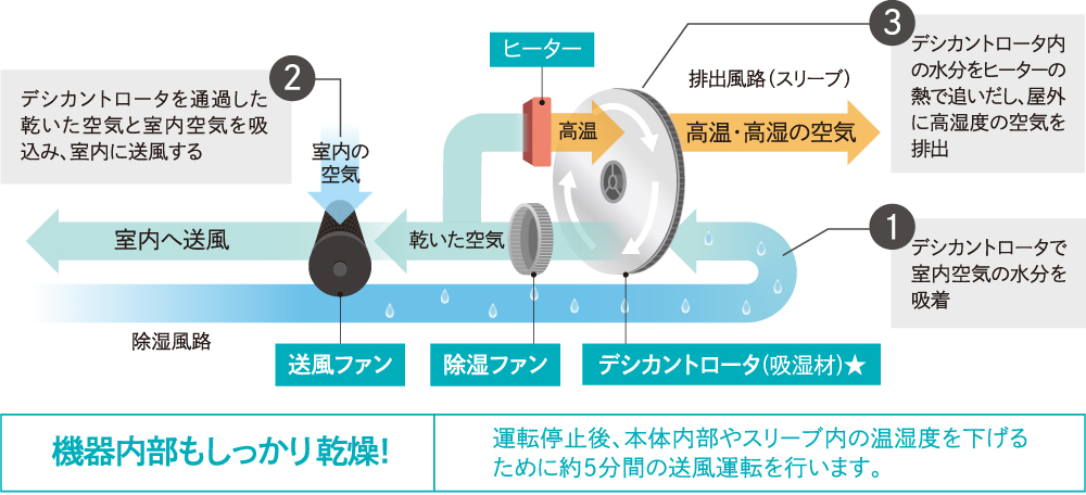 ヒーターでデシカントロータを温めて除湿するため、冬場も安定した除湿能力を発揮。1年を通して活躍します。