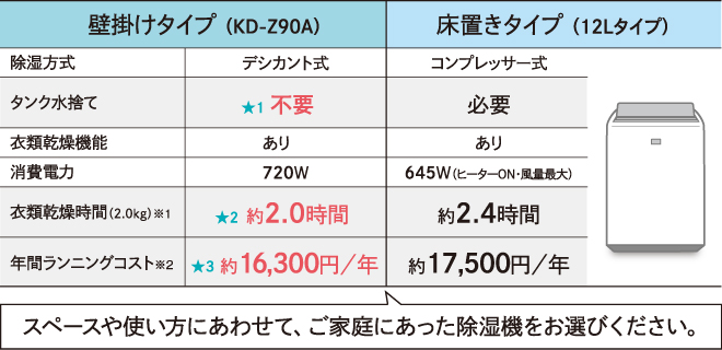 当社、床置き除湿機の高性能モデル(12Lタイプ)と比較。それぞれの優れた性能がひと目で分かります。