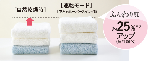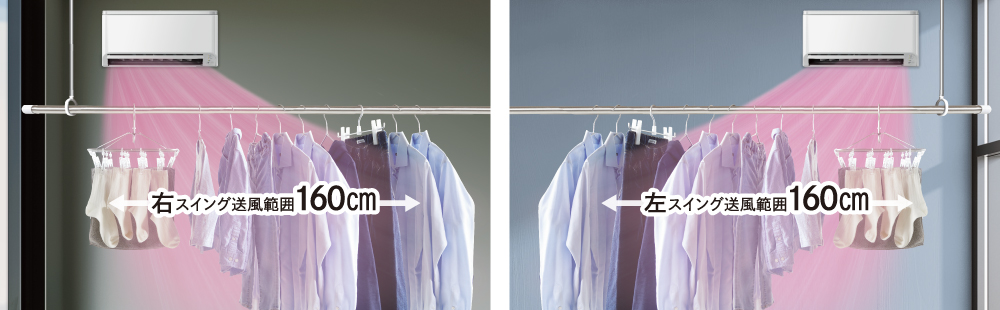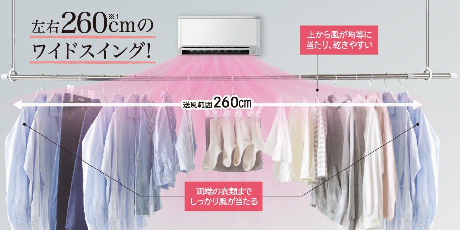 上下左右の幅広い送風範囲と、遠くまで届く大風量の送風で、両端の衣類までムラを抑えてしっかり乾燥。洗濯物がふんわり仕上がります。