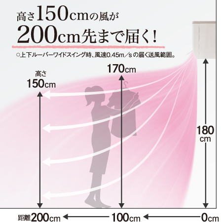 - ※1 左右ルーバーワイドスイング時、運転モード「衣類乾燥:速乾(風量5)」 吹出口より前方約100cmにおける送風範囲。(風速0.45m/s の届く範囲)