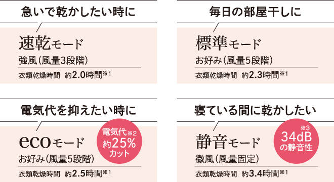 - ※1 室温20℃湿度60%のランドリールームで2kgの洗濯物を干した場合の値。各モードの最大風量時。2026年2月現在。