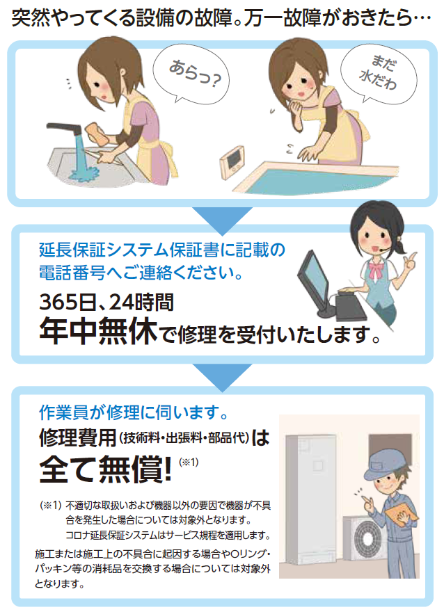 コロナ給湯システム・暖房システム・空調システムを長く安心してお使いいただくために、コロナでは「5年・8年・10年延長修理保証契約」制度を設けております。この機会にぜひご検討、お申込みいただけますようご案内いたします。