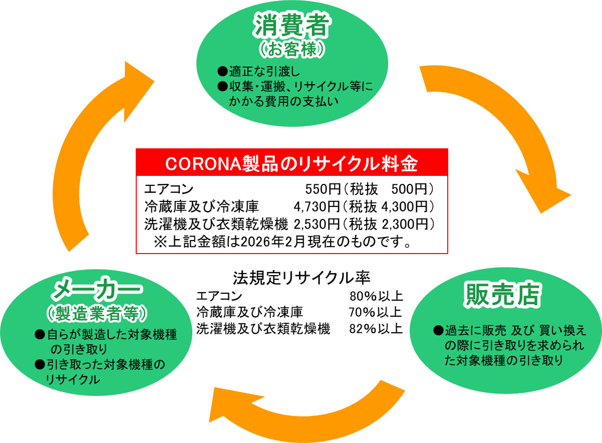このように、廃家電品を再資源化するための処理には費用がかかります。家電リサイクル法では、この費用(「小売店の収集・運搬料金」と「メーカーのリサイクル料金」)を消費者が負担し、小売店による収集・運搬、メーカーによる再商品化(リサイクル)といった様に、それぞれの役割分担が必要不可欠です。料金は小売店ごとに収集・運搬料金が、製造業者等ごとにリサイクル料金が異なります。当社商品のリサイクル料金は下図に表示しております。