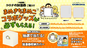 加湿器HSシリーズを期間内にご購入・ご応募いただいた方の中から、抽選で「まめきちまめこオリジナルイラスト入り 加湿器収納カバー」他をプレゼント。