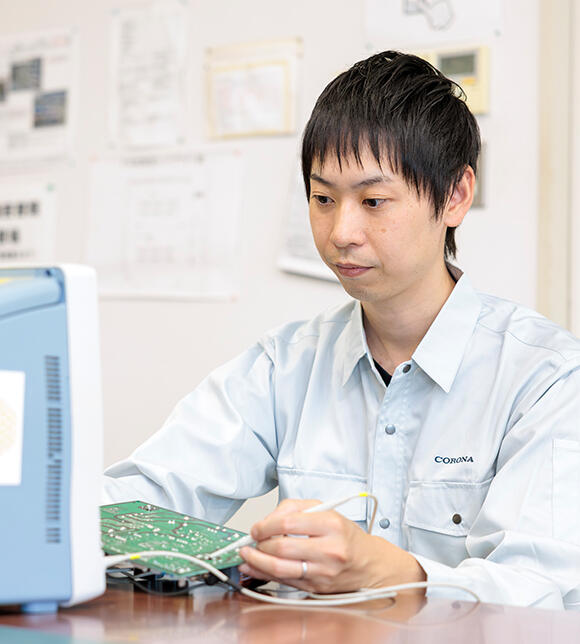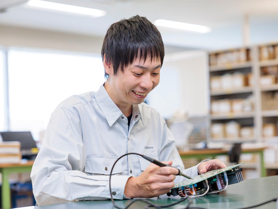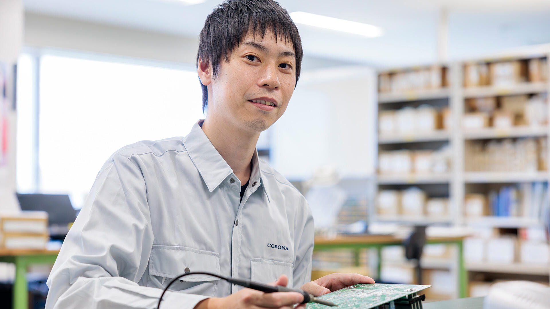 完成品メーカーで、かつ新潟県内で働きたいという思いがあり、真っ先に思いついた会社がコロナだったというのが始まりでした。その後、日常生活の中でファンヒーターやエアコン、エコキュートといった多くの家電製品がコロナで作られていることを改めて知り、私もこれらの製品の設計・開発に携わりたいという思いが強くなり、入社を希望しました。
