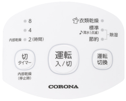 - ※1 除湿機の衣類乾燥性能は、一般社団法人 日本電機工業会自主基準(JEMA-HD090:2017)に基づき以下の条件のもとで試験を行った値です。試験条件/●部屋の広さ6畳●室温20℃湿度70%●洗濯物2kg相当:Tシャツ3枚、Yシャツ2枚、パジャマ1組、下着7枚、靴下2足、タオル3枚●運転モード「衣類乾燥」運転60Hz地区。なお実使用時の衣類乾燥時間は使用環境・使用条件により異なります。