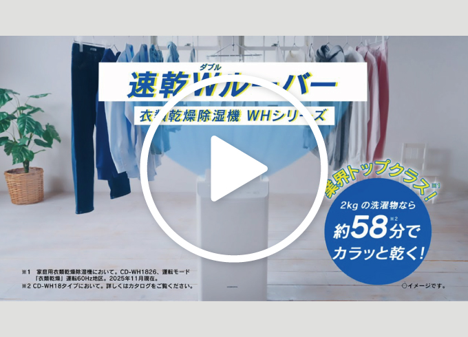 - ※1 CD-WH18タイプにおいて。CD-WH12タイプは約69分となります。除湿機の衣類乾燥性能は、一般社団法人 日本電機工業会 自主基準(JEMA-HD 090:2017)に基づき以下の条件のもとで試験を行った値です。試験条件/●部屋の広さ6畳●室温20℃湿度70%●洗濯物2kg相当:Tシャツ3枚、Yシャツ2枚、パジャマ1組、下着7枚、靴下2足、タオル3枚●運転モード「衣類乾燥」運転60Hz地区。なお実使用時の衣類乾燥時間は使用環境・使用条件により異なります。