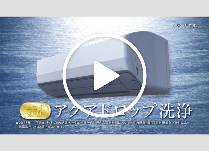 - ※1 CSH-SP28タイプ当社環境試験室において、室内温度27℃、湿度60%、室外温度27℃にてアクアドロップ洗浄で運転した場合の結露水発生量。この時の電気代は約27円/回がかかります。電力料金目安単価31円/kWh(税込)[2022年7月改定]