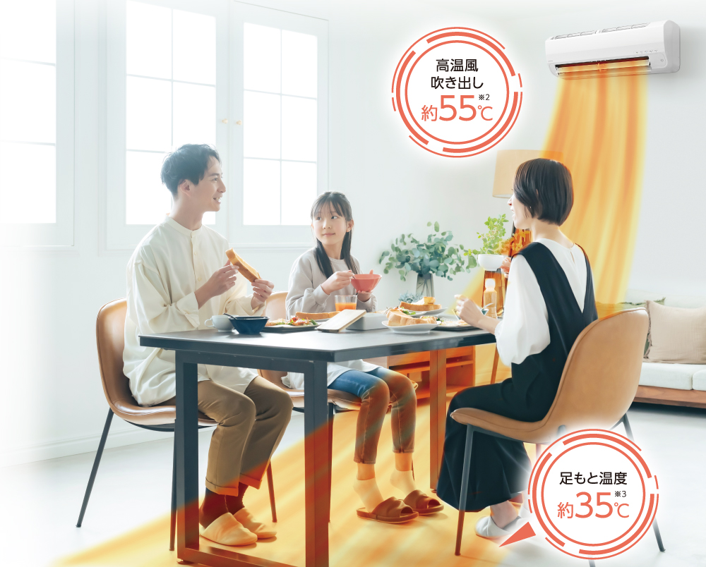 - ※3 2.8kWタイプの値。当社環境試験室(10畳)において、外気温2℃、設定温度25℃。エアコンから2m離れた地点で床上5cmの最高温度。使用環境、使用状況により温度は異なります。