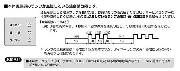 その際、点滅しているランプの種類・色・点滅回数をお知らせください。●運転(セーブ)ランプ[緑]が点滅(1秒間に1回の連続)している場合は停電表示です。