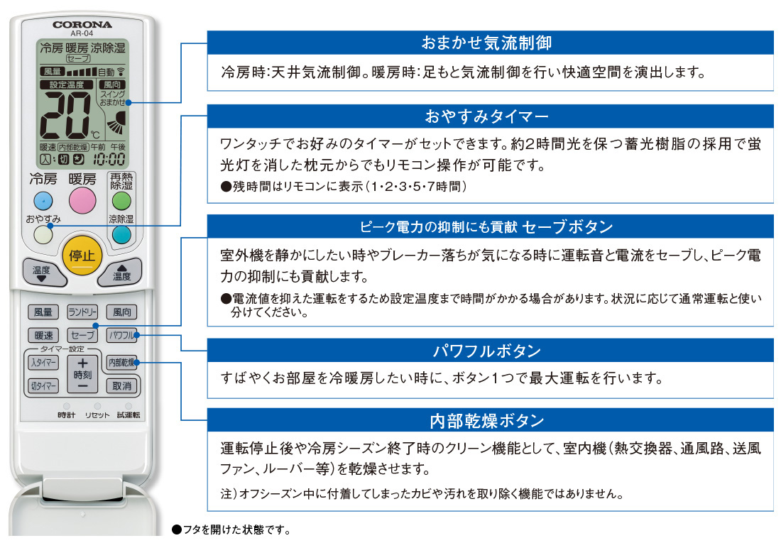 リモコンに2つの除湿ボタンをつけて、除湿の切り換えが簡単にできるようになりました。