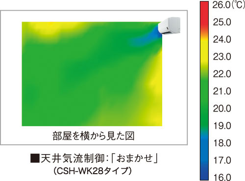 - ※2 CSH-WK28AR2の値。当社環境試験室(10畳)において、外気温-15℃、室温20℃、風量レベル2設定(風量は暖房定格に対して約50%)、風向上から2段目、設定温度24℃以上、暖房時の吹き出し口付近の最高温度。継続時間は約60分。使用条件によっては50℃にならない場合があります。
