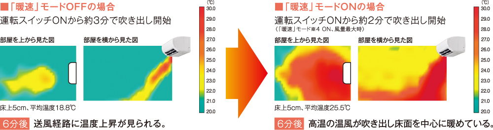 「暖速」モードでコンプレッサーをあらかじめ予熱しておくことによって、暖房時の立ち上がりのスピードが飛躍的に向上しました。