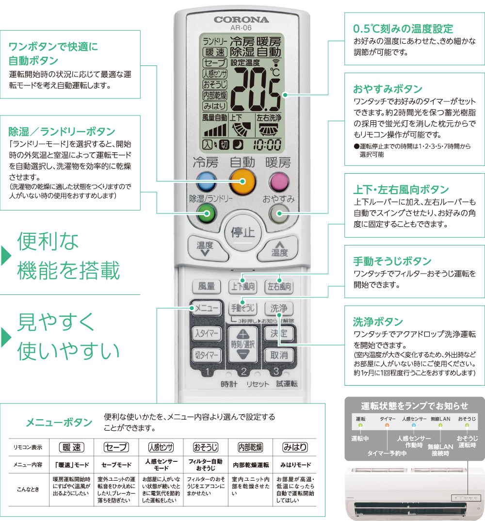 コロナ快適ホームアプリを使えば、遠隔操作や見える化が可能に。自宅や離れて暮らすご家族のみまもりができます。エアコンの操作ができるだけでなく取扱説明書のダウンロードやWEB修理受付など便利な機能を満載しています。