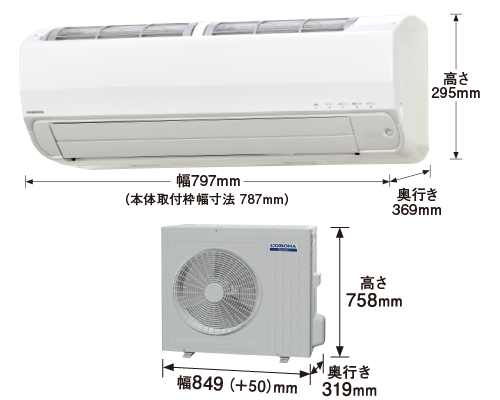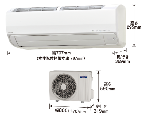 | 室内機 | 高さ295・幅797・奥行369mm/質量13.0kg ※本体取付枠幅寸法は、787mmです。 |