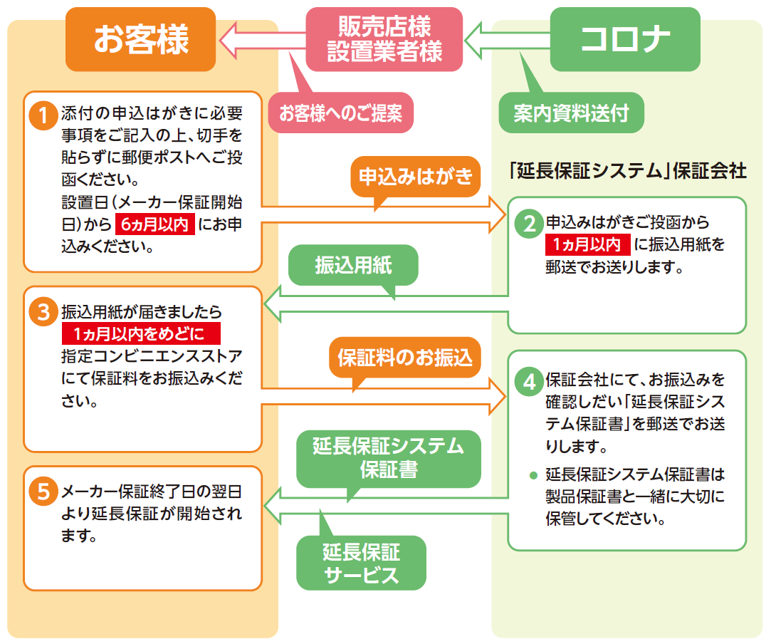 コロナ給湯システム・暖房システム・空調システムを長く安心してお使いいただくために、コロナでは「5年・8年・10年延長修理保証契約」制度を設けております。この機会にぜひご検討、お申込みいただけますようご案内いたします。