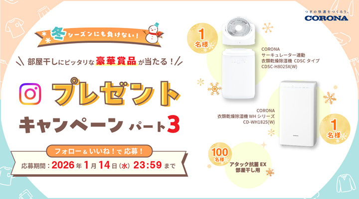 “冬の洗濯ストレス”を解決!衣類乾燥除湿機が当たるプレゼントキャンペーンの第三弾を開催中!詳細はInstagramにて。