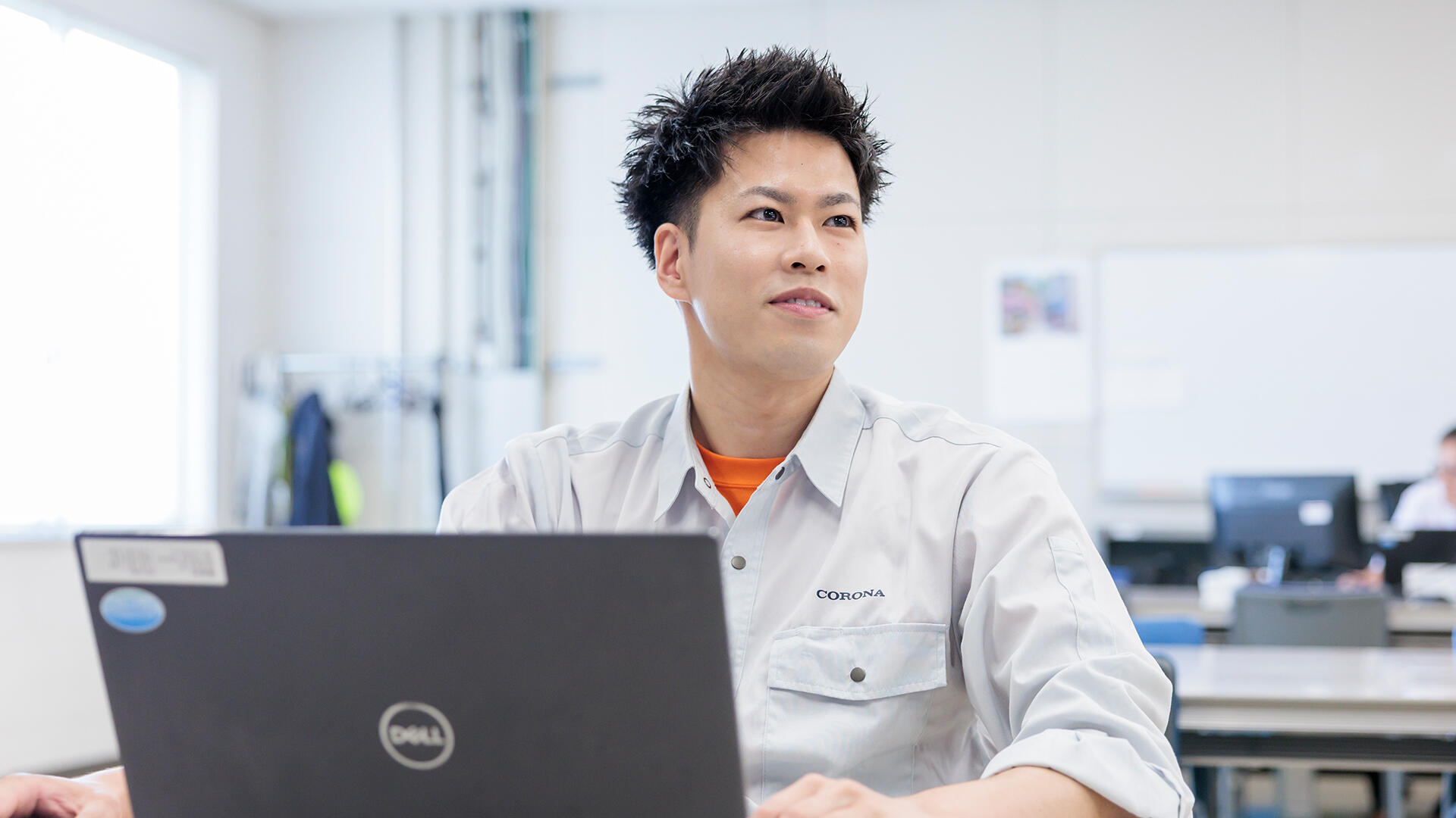大学までバレーボール一筋で頑張ってきて、卒業後プロになるか地元に戻って就職するか考えた際に、地元で就職する決断をしました。その時になりたい職業や、どこで働きたいかなど明確に決まっていなくて悩んでいた時に、小さいころからコロナの製品に触れることが多く、ここで働きたいと思い志望しました。